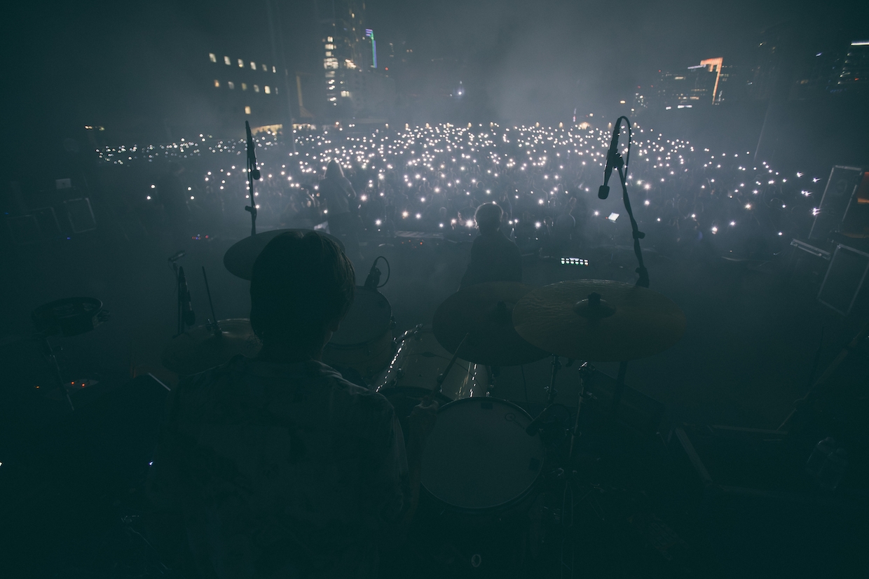 The front of the stage house incorporates roller shutter doors, which retract to allow large speaker arrays to project during performances, then return to their protected enclosure when not in use.